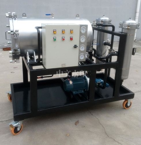 本機是專用於親水材料製成聚結濾芯和憎水材料製成脫水濾汞,並按一定比例配置後優化設計而成。根據混入油中水分的不同物理作用,油液中的遊離水以及乳化水在通過聚結濾芯後被聚結成直徑較大的水滴,然後再經脫水濾芯將大量水滴分離出來,並在重力作用下沉降在儲水罐內被自動排掉,便完成一次油水分離。本設備集自動破乳、脫水、過濾等功能於一體,能有效濾除油中的水分和雜質。